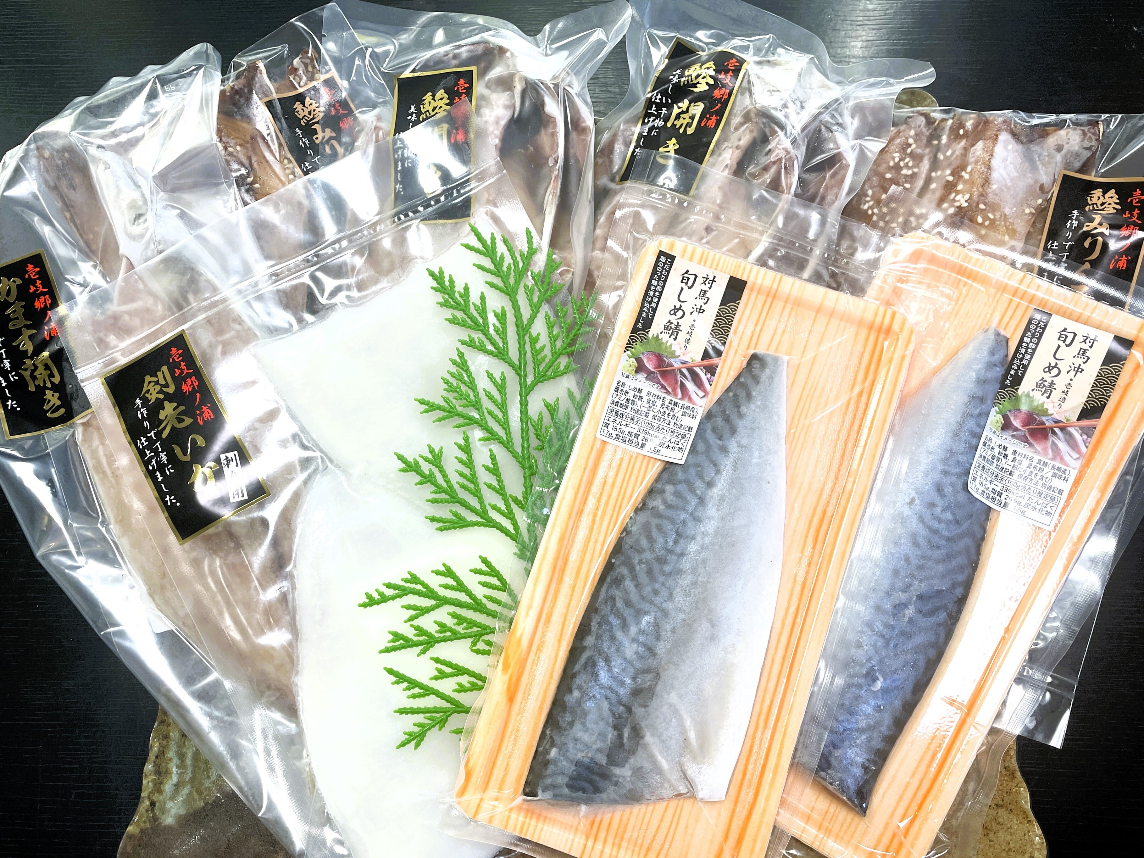壱岐の豊かな海が育んだ新鮮な海産物を詰め合わせました!あじの開き、あじのみりん干し、旬しめ鯖、かますの開き、そしてイカのバリエーション豊かなラインナップが揃っています。それぞれの素材が持つ旨味を最大限に引き出し、食卓に鮮やかな彩りを添える一品です。