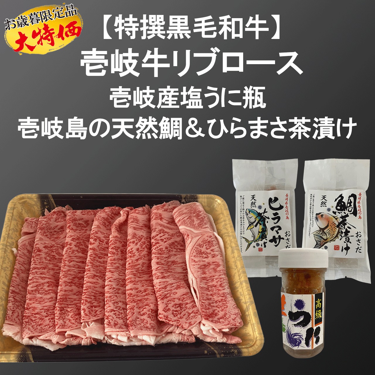 年間約900頭しか出荷されない希少な壱岐牛リブロースに、濃厚な壱岐産うに、天然鯛茶漬け・天然ひらまさ茶漬けを詰め込んだ贅沢セット。